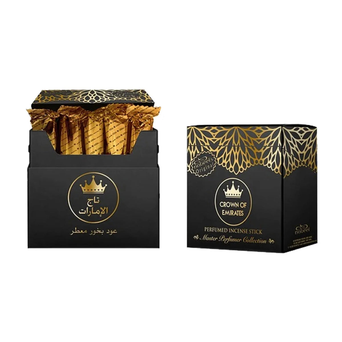 La confezione elegante, raffigurata nell'immagine, rivela un mazzo di incensi avvolti in carta dorata decorata, all'interno di una scatola nera ornata da motivi dorati ispirati all'arte araba tradizionale. Il logo della corona suggerisce un prodotto premium, degno dei palazzi reali.